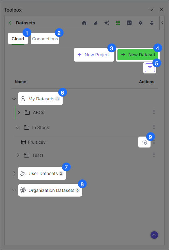 When you first access Datasets, you are prompted to create a new project. You can think of projects as folders for storing your datasets. Create a project at any time using the following steps:-