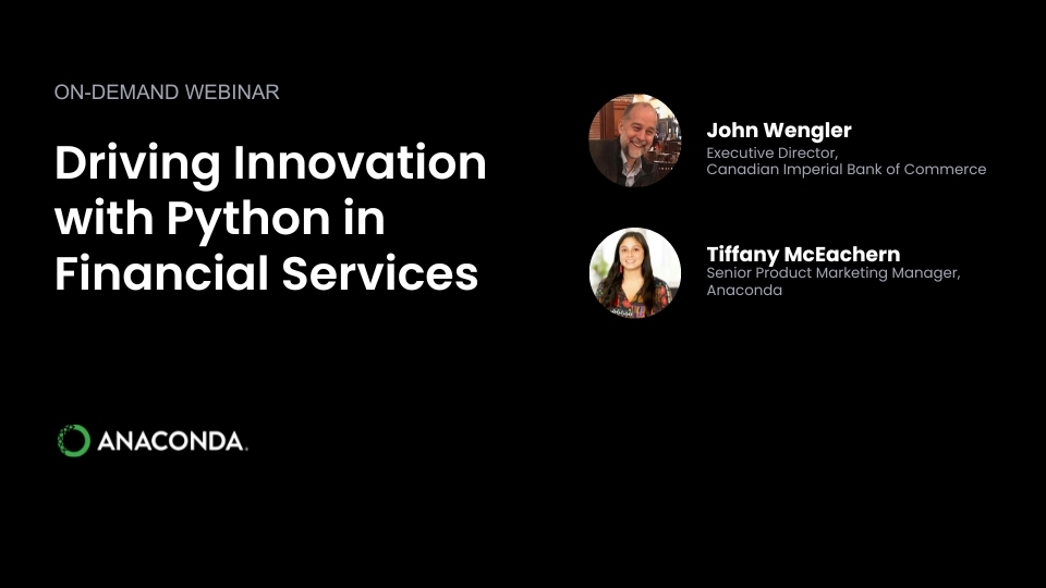 Now available to watch on-demand, learn how the Canadian Imperial Bank of Commerce reduced analysis time and streamlined workflows using Python and Anaconda in a highly regulated environment. Discover practical strategies for Python adoption in financial services, from addressing audit concerns to implementing Anaconda’s secure, governed enterprise solutions.