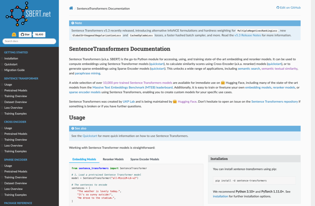 Who uses it: Data scientists and engineers building semantic search engines, recommendation systems, duplicate detection pipelines, and RAG applications. SentenceTransformers is increasingly the default choice for the embedding layer in any workflow that requires comparing or retrieving text by meaning rather than keyword match.