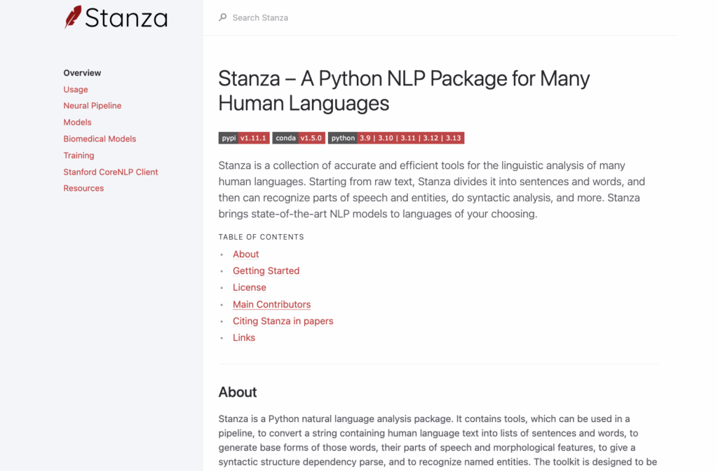Pros: Strong multilingual coverage; high accuracy across languages due to neural network architecture; clean Python API; backed by Stanford NLP Group’s ongoing research; well-documented with active maintenance.