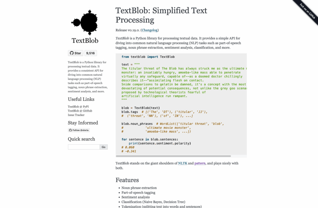 Who uses it: Python developers and data analysts who are getting started with natural language processing, as well as teams that need to add lightweight text data processing to a project without significant overhead. TextBlob is a useful prototyping tool, but most teams will eventually graduate to spaCy or Hugging Face as their needs grow.