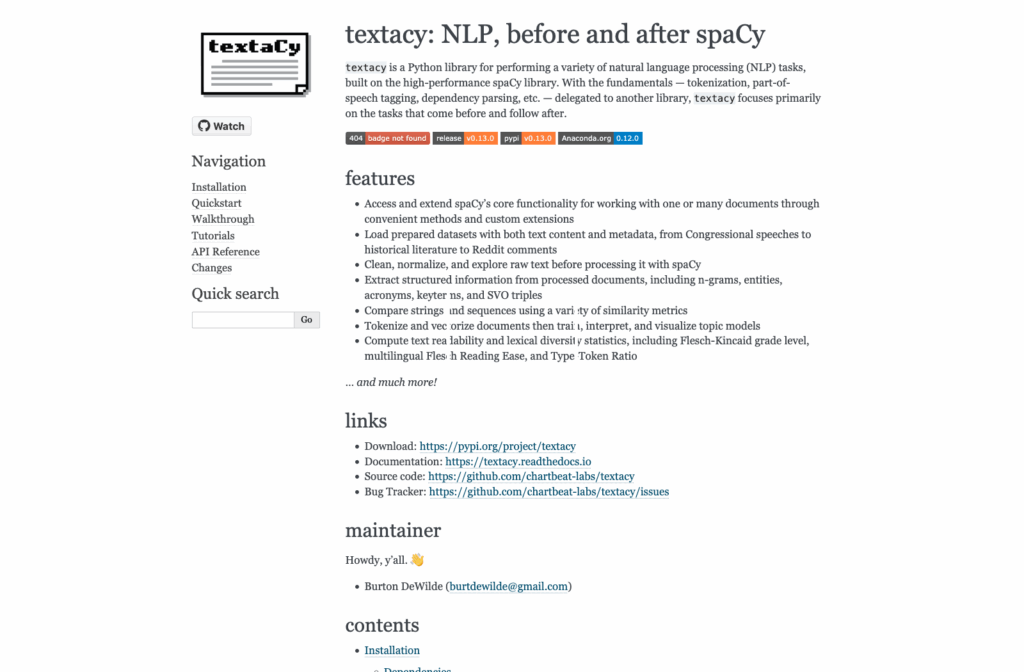 Cons: Tightly coupled to spaCy, so it’s not useful outside of a spaCy workflow; the most recent PyPI release was in 2023 and the project shows limited maintenance activity, which is worth monitoring if spaCy compatibility becomes an issue.