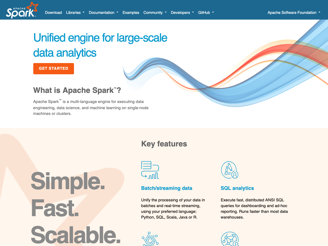 Apache Spark is a unified engine for big data processing and large-scale analytics, with support for SQL, streaming, and machine learning.