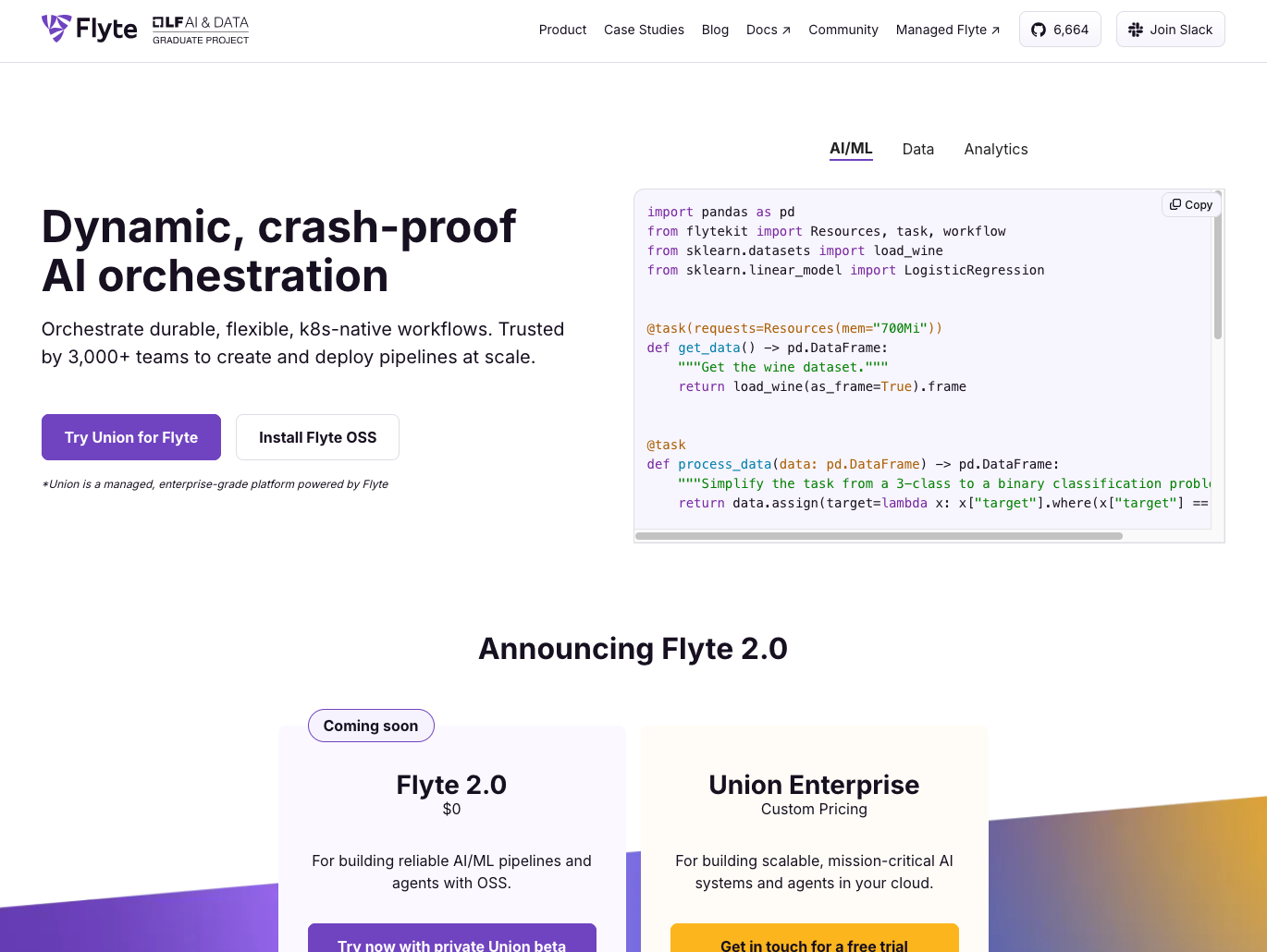 Flyte provides infrastructure for building, deploying, and monitoring ML and data pipelines with strong reproducibility guarantees. It uses containerized tasks and versioned workflows, ensuring pipelines produce consistent results across different environments. Flyte handles compute resource management, allowing workflows to request specific CPU, GPU, or memory requirements per task.