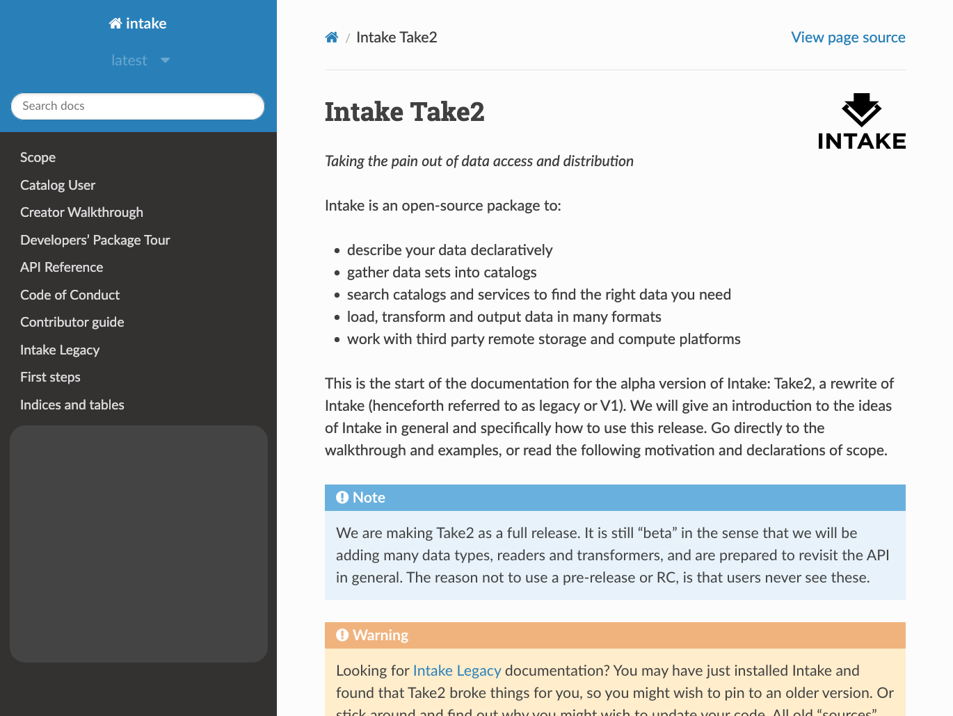Intake comes pre-installed with Anaconda Distribution. View the package details here.