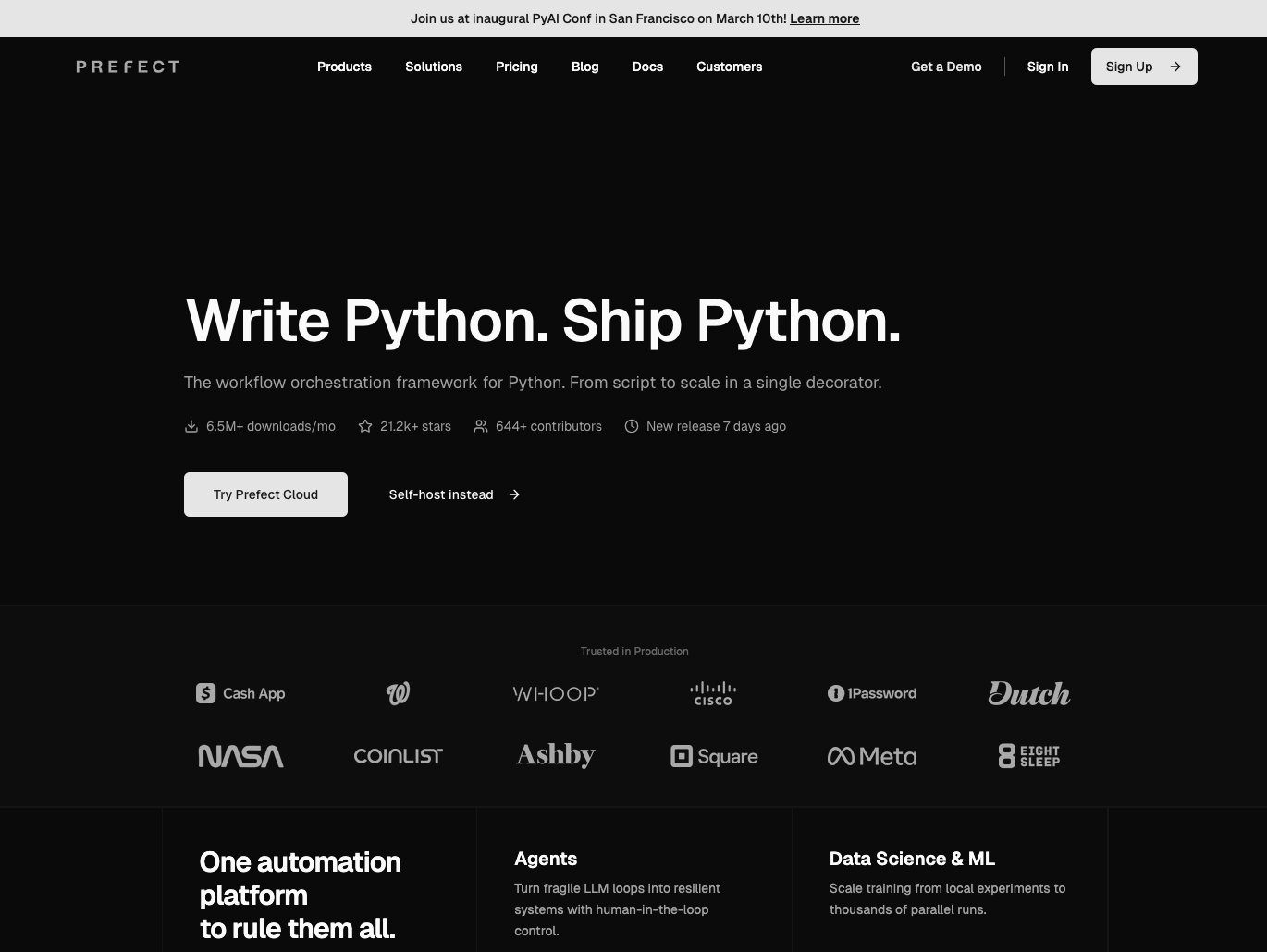 Prefect provides a Python-native approach to workflow automation with a focus on developer experience. Unlike traditional workflow tools, Prefect uses standard Python code with decorators to define tasks and flows, making pipelines easy to write, test, and debug. It includes built-in features for retries, caching, logging, and observability.
